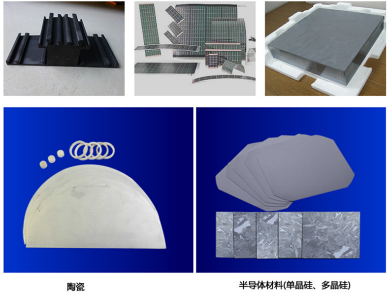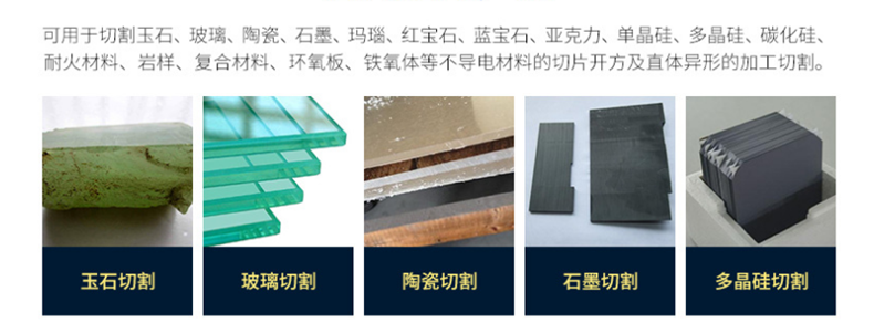 本加工方法是對電火花切割機(jī)床難以加工的不導(dǎo)電材料的補(bǔ)充。原則上對導(dǎo)電和不材料只要硬度比砂線小均可加工,對用電火花線切割機(jī)床加工難以加工的石墨材料,采用本產(chǎn)品加工尤能顯示其無比的優(yōu)越性;對脆性材料如注塑泡沫材料、復(fù)合材料、陶瓷、環(huán)氧板、鐵氧板、半導(dǎo)體材料、碳化硅、耐火磚、非導(dǎo)電材料等具有一定脆性材料的成型切割均可加工。